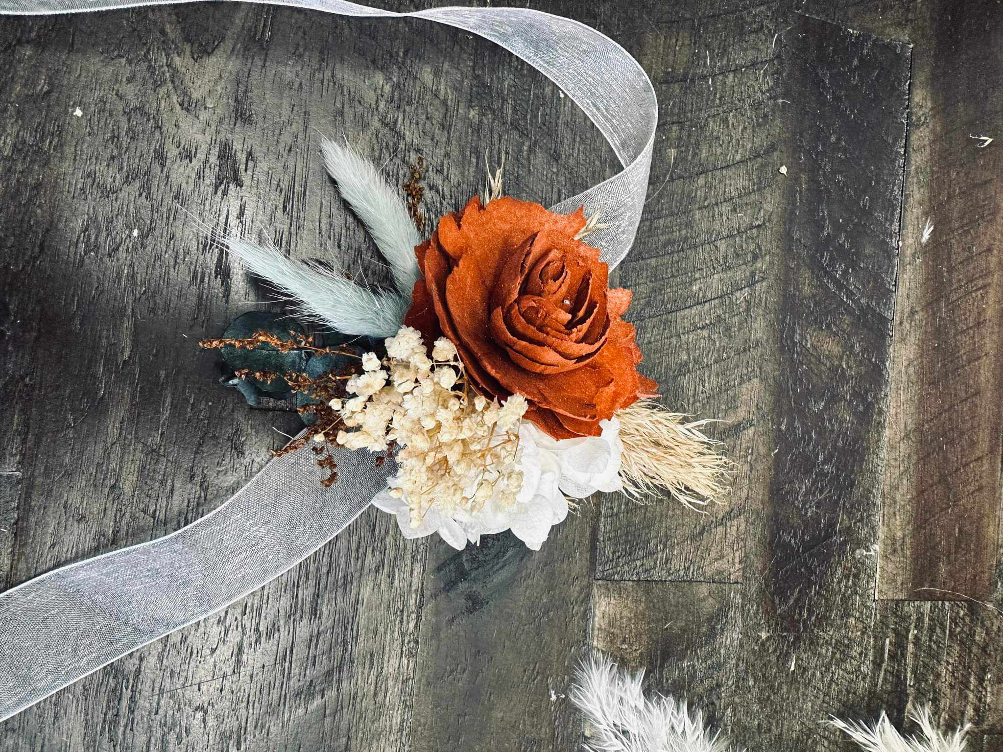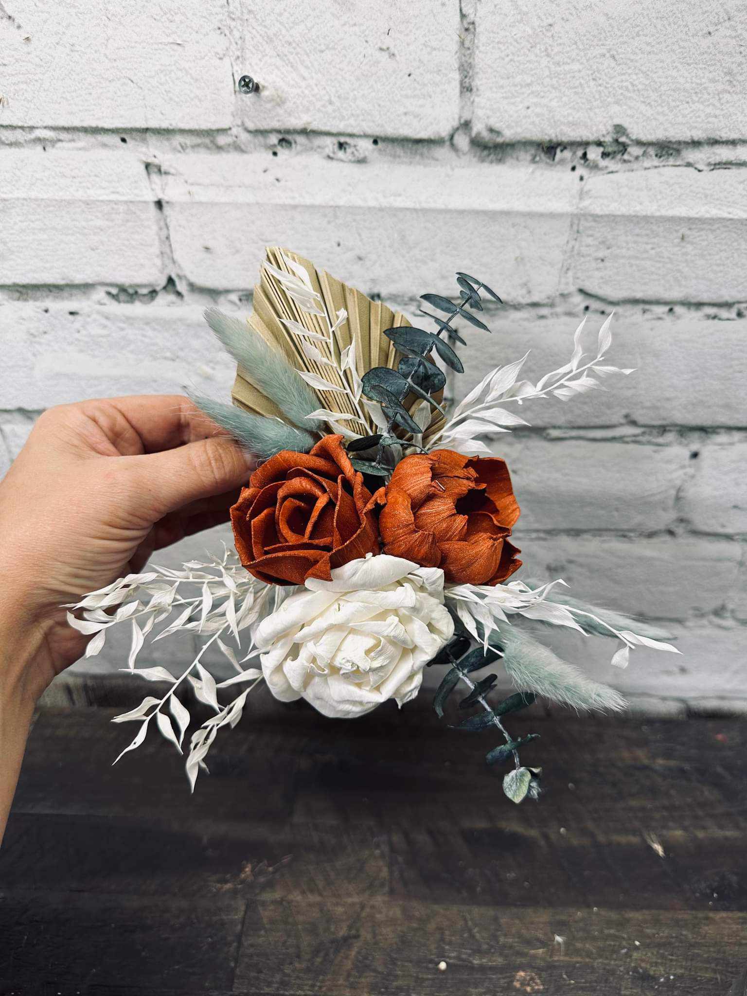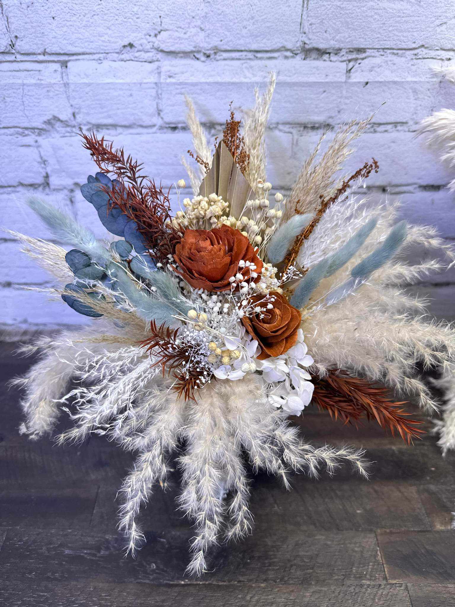 Rusty Blues Collection:: Rustic boho takes on a lil shine! Our rust dye has a little shimmer to brighten your day! This set of hand dyed wood flowers are finished with real preserved spiral & silver dollar eucalyptus, sun palms, hydrangeas, bunny tails, babies breath, ruscus, and natural dried fillers. Our "Rusty Blues" Collection will bring your whole look together, and warm the hearts of everyone in attendance.