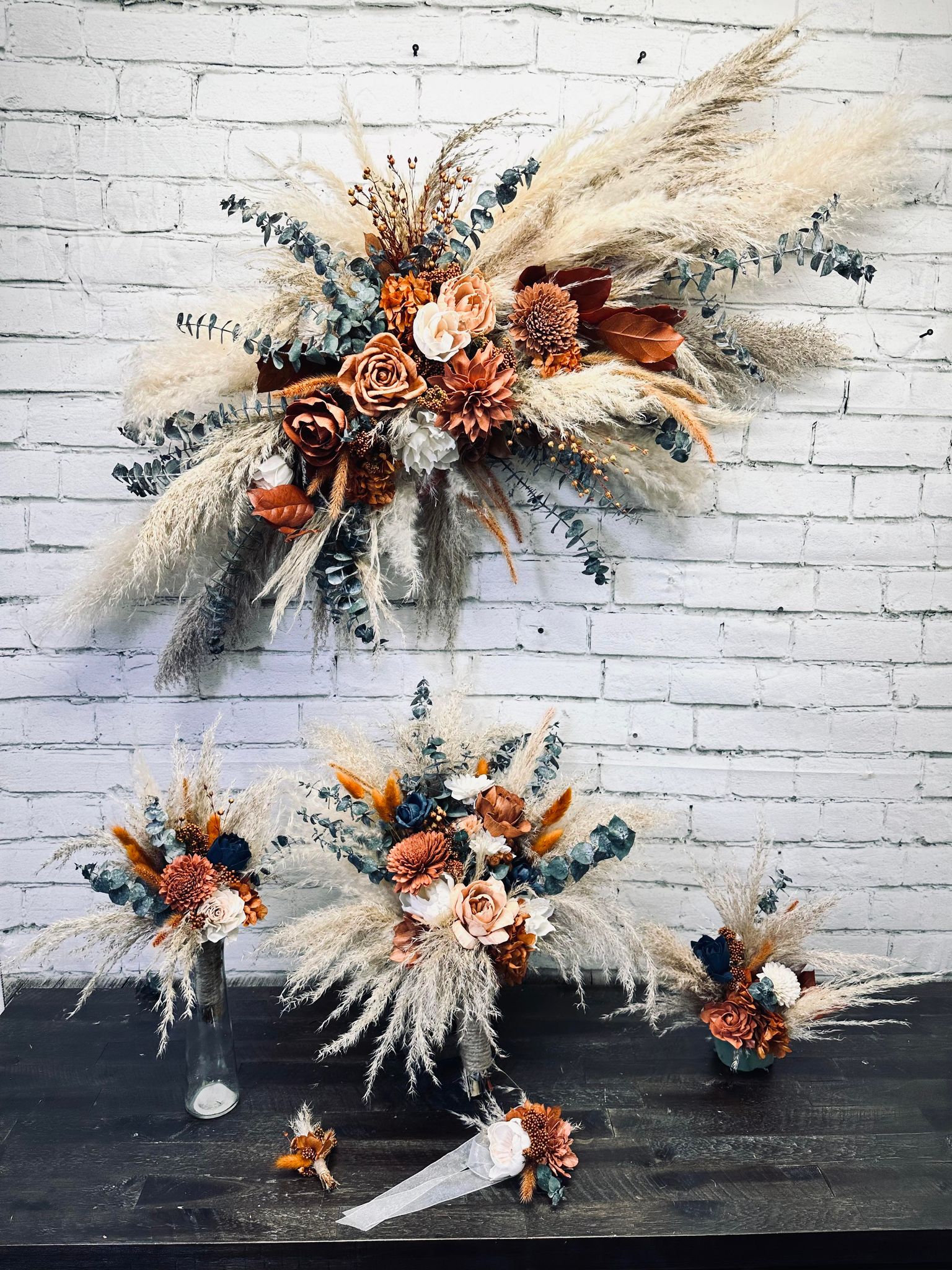 We strive to create every collection as close to the original as possible. These items are hand-crafted. Slight differences from the main photos will occur, as you are not purchasing the photographed items. Your collection is being made to order.. Flower design and fillers may vary due to availability of products.