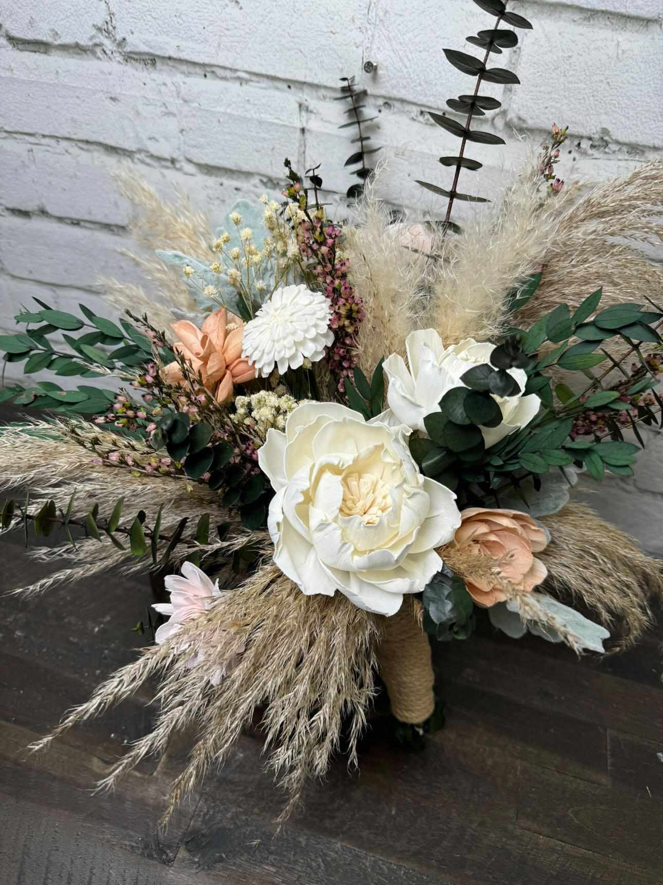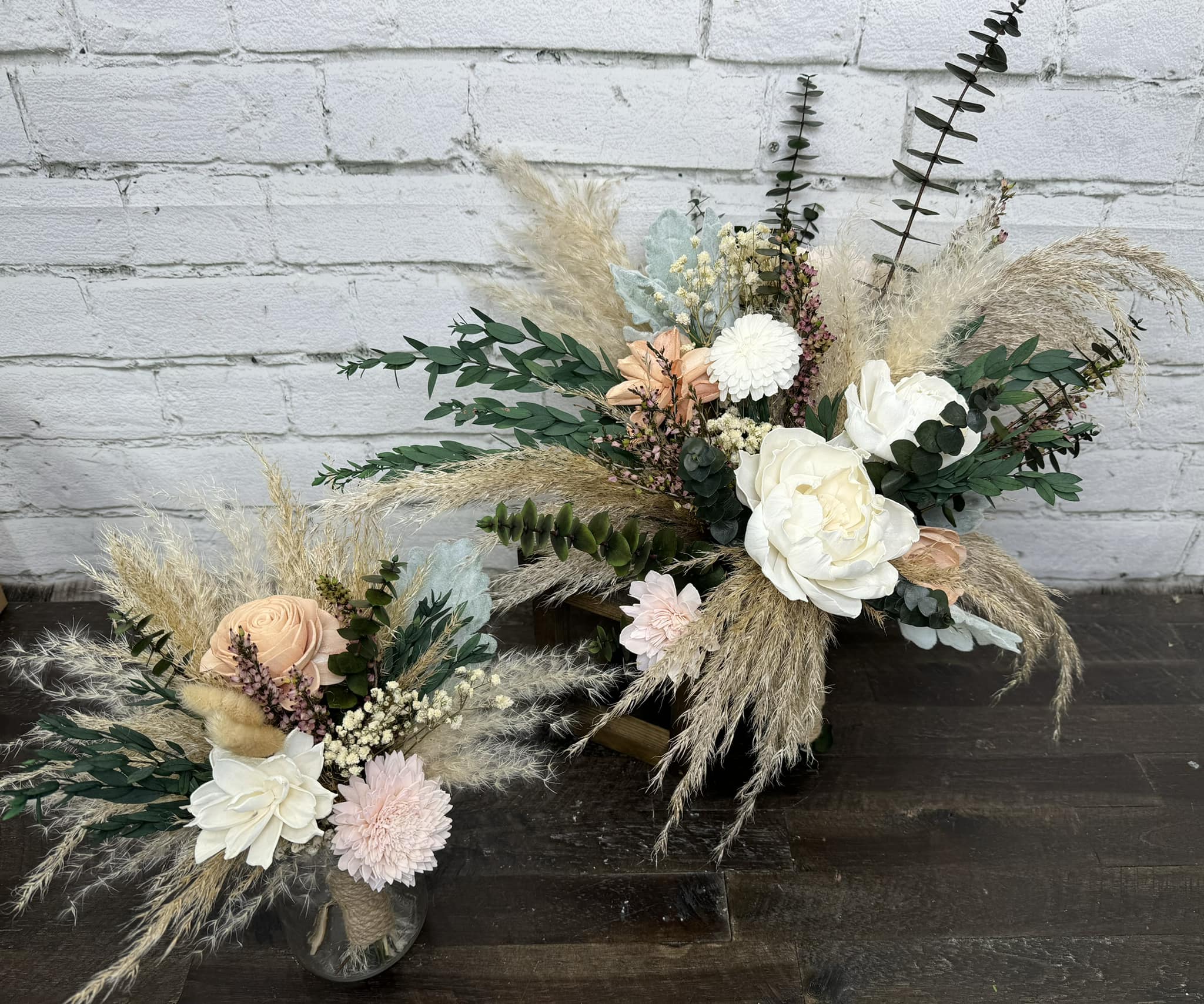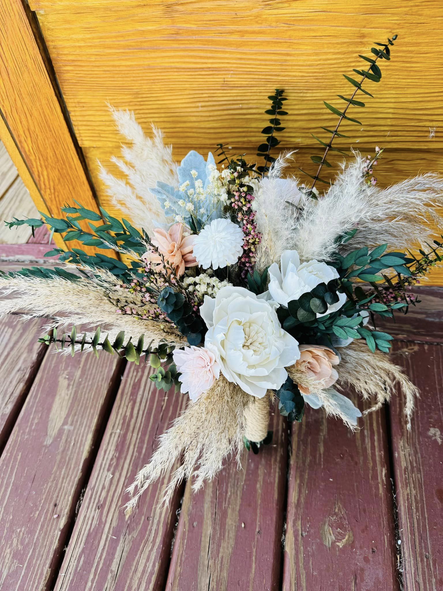 Serenity Collection:: Check florals off your list, because you have found the perfect set for your wedding day! A soft variety of hand dyed wood flowers, finished with real preserved spiral eucalyptus, pampas, babies breath, bunny tails, dusty miller, natural dried fillers, and greenery. Our "Serenity" Collection will complement any style bride with its romantic boho vibes!