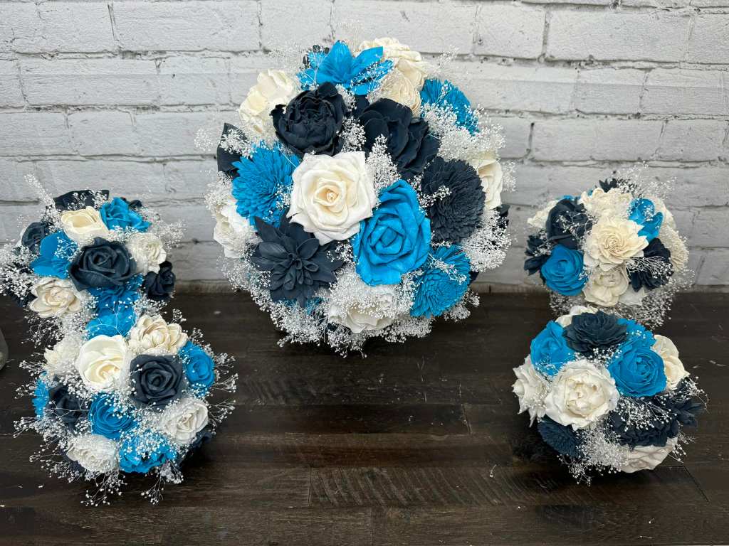 We strive to create every collection as close to the original as possible. These items are hand-crafted. Slight differences from the main photos will occur, as you are not purchasing the photographed items. Your collection is being made to order.. Flower design and fillers may vary due to availability of products.