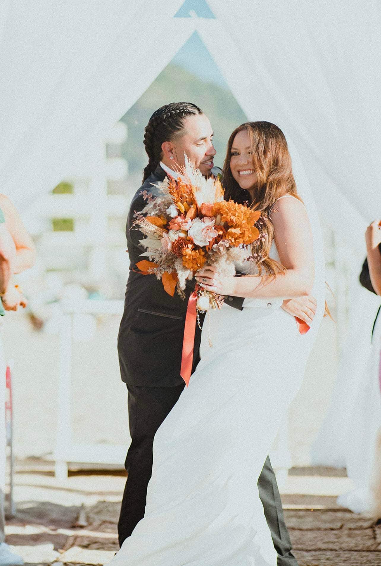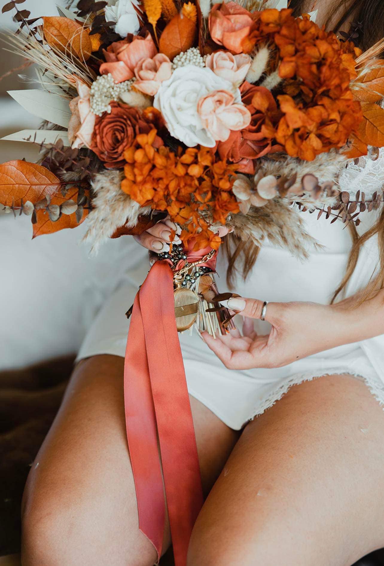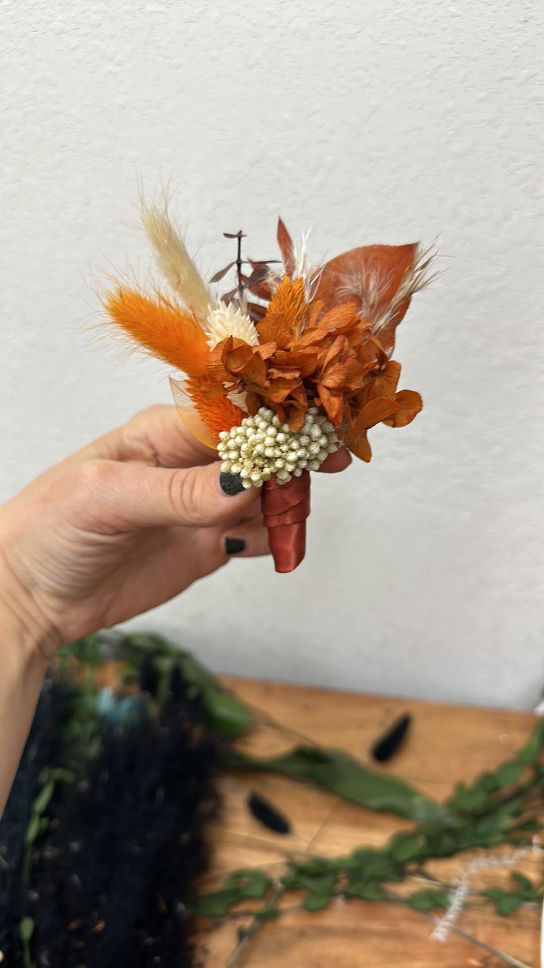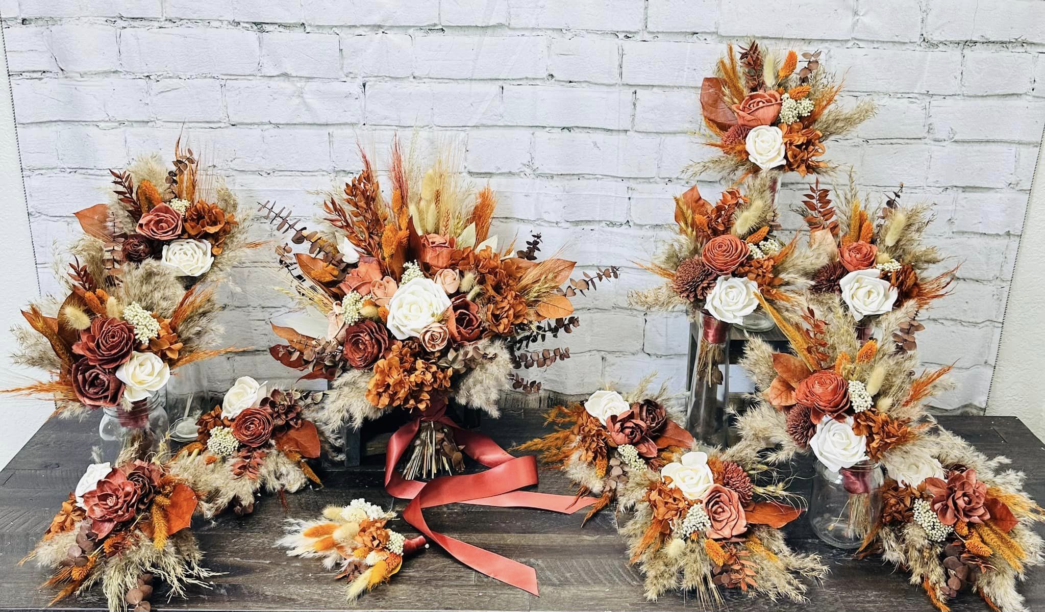 Spanish Sunset Collection:: This set brings rustic and boho to a new level! The mixed oranges give it depth, with a soft pop of Ivory. It's highlighted with all real preserved pampas, babies' breath, spiral eucalyptus, salal, and hydrangeas! Spanish Sunset will warm up your wedding no matter what time of year it is.