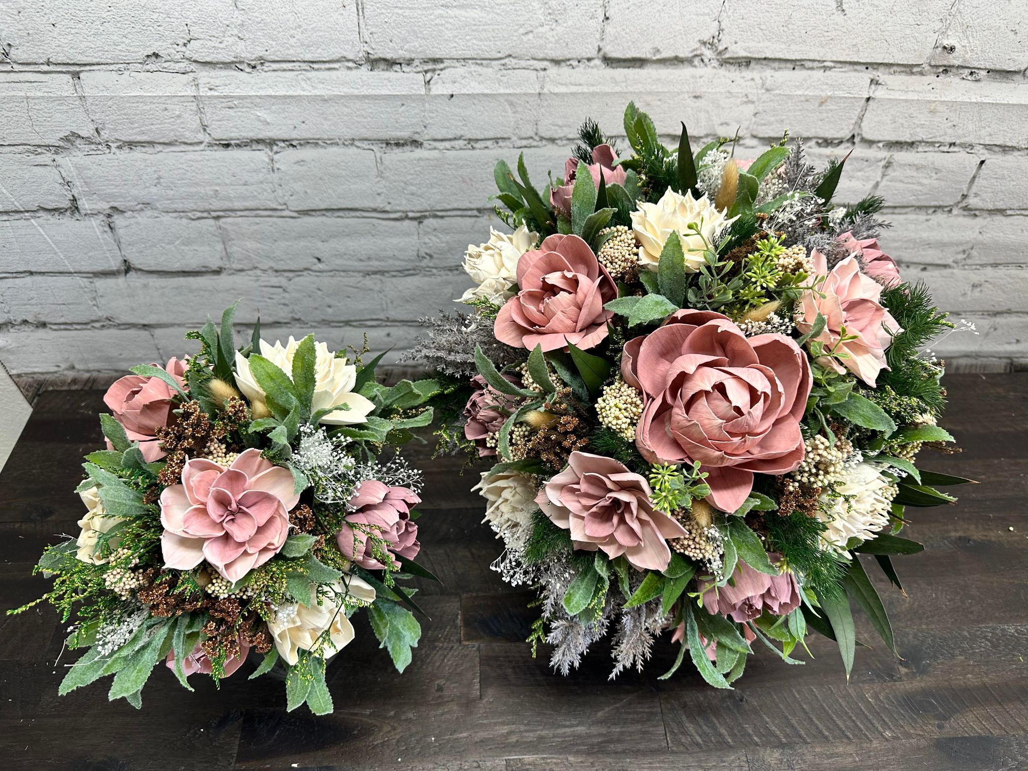 We strive to create every collection as close to the original as possible. These items are hand-crafted. Slight differences from the main photos will occur, as you are not purchasing the photographed items. Your collection is being made to order.. Flower design and fillers may vary due to availability of products.