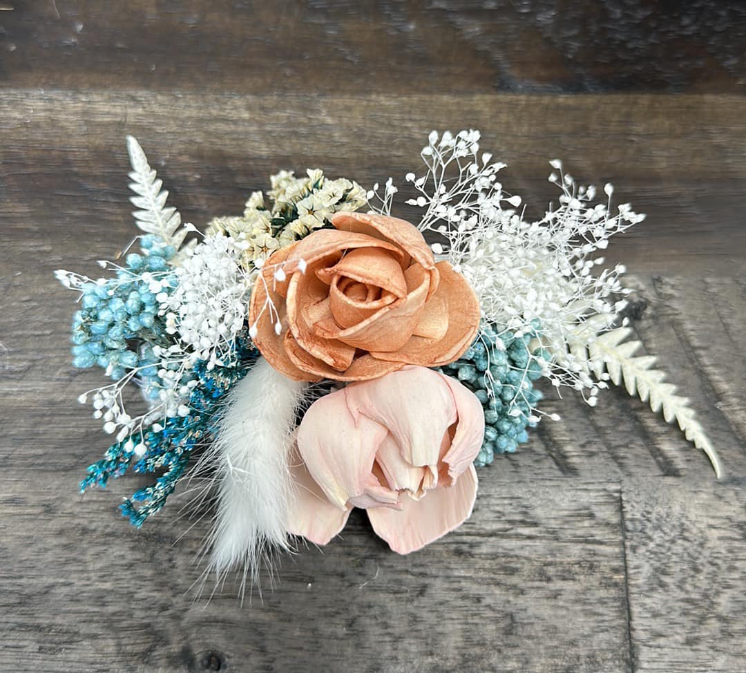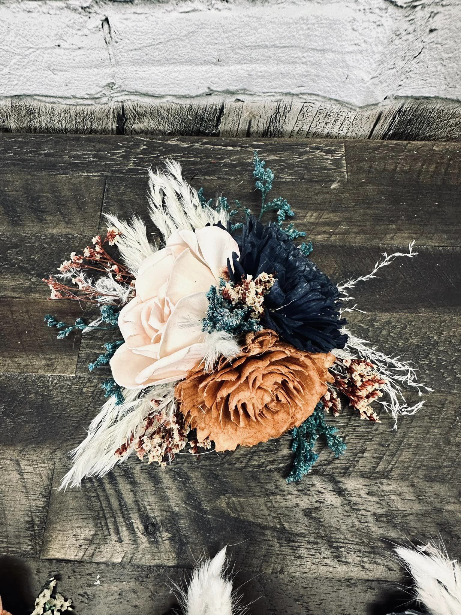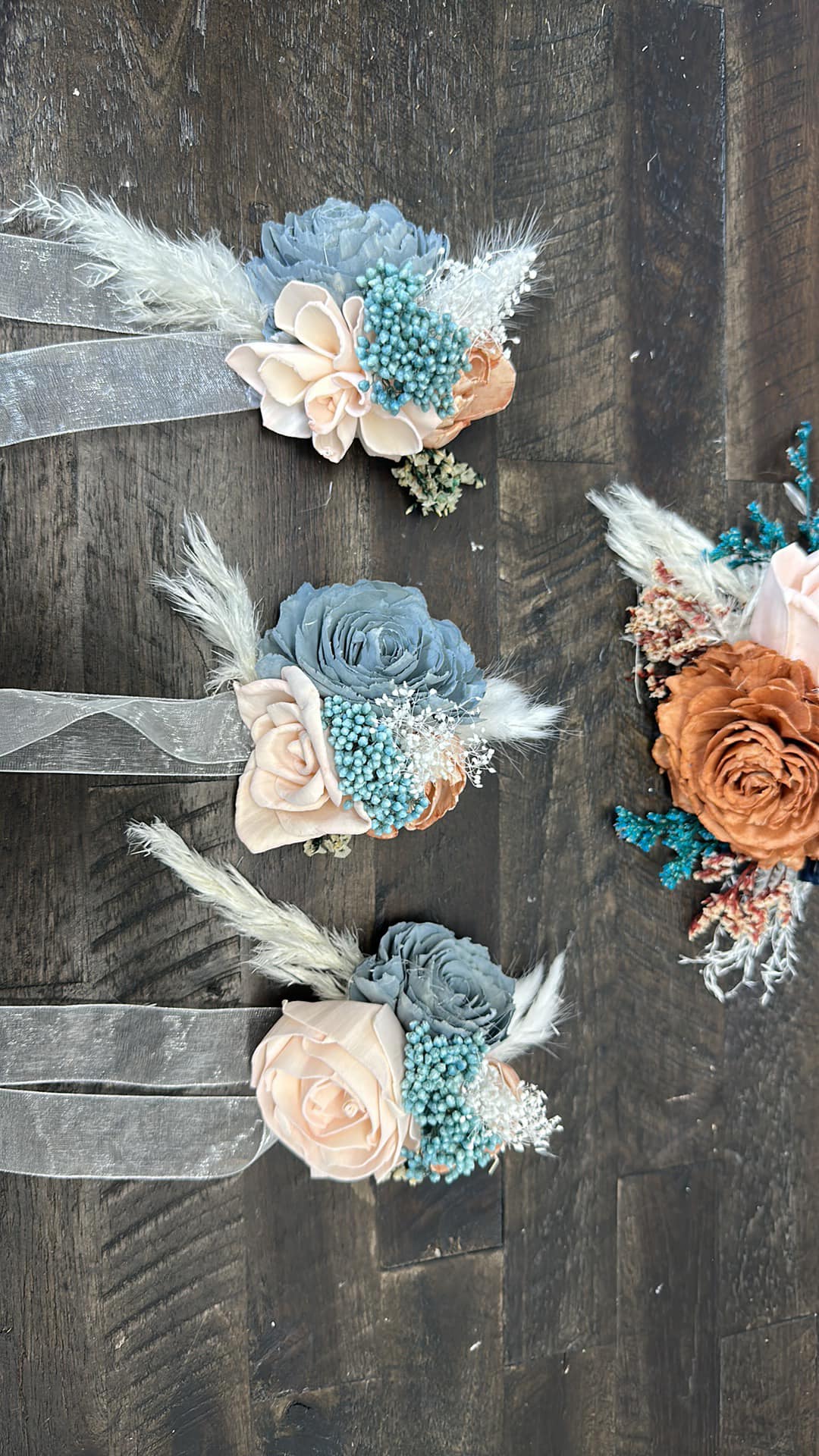 Summer Blossom Collection:: Whether its April showers, May flowers, or somewhere when its snowing; this soft color theme is perfect for any time of year. wood flowers surrounded by real preserved white pampas, spiral eucalyptus, hydrangeas, and other fillers. Take the flower harvest with you on your wedding day with our Summer Blossom Collection!