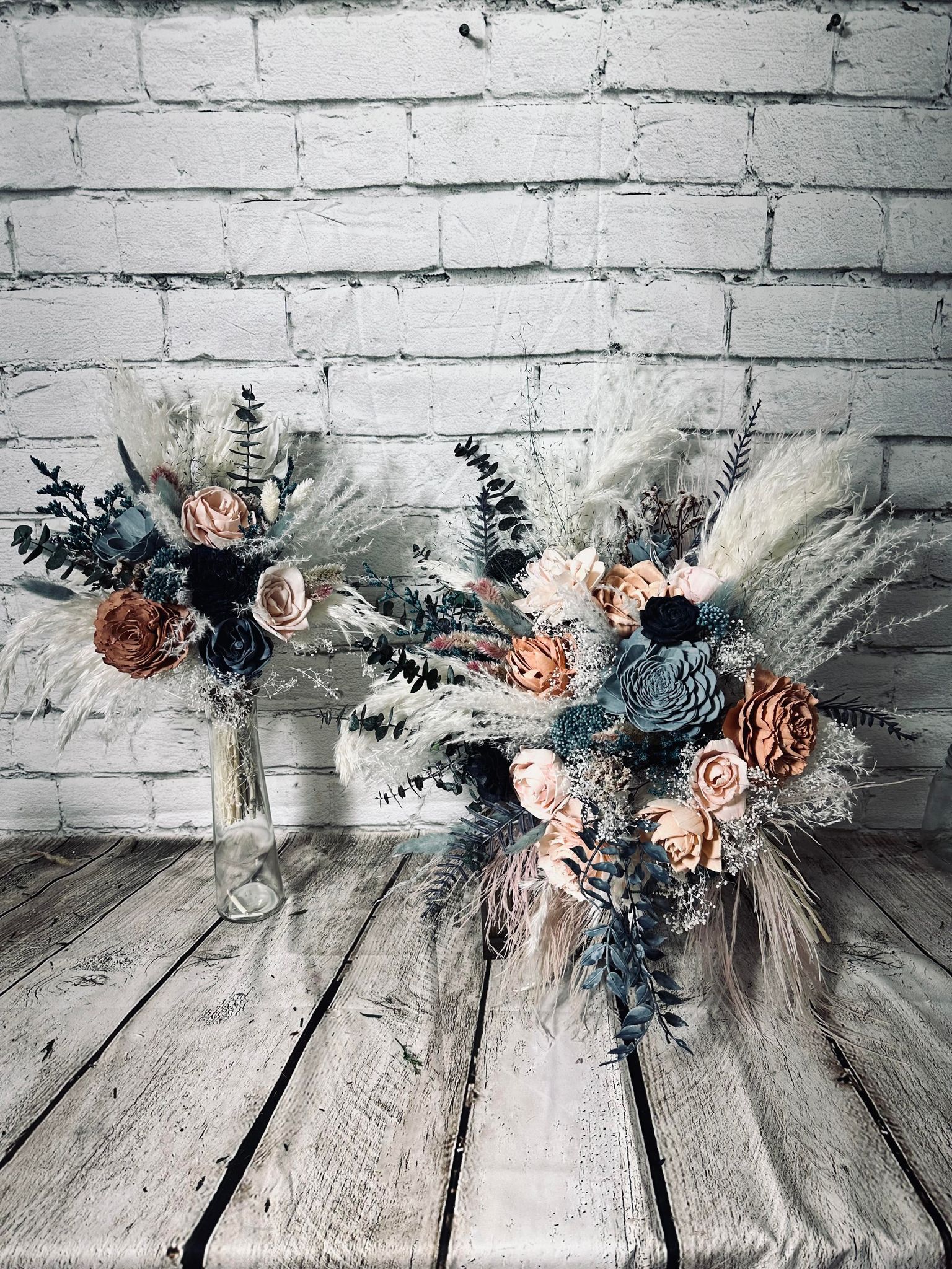 We strive to create every collection as close to the original as possible. These items are hand-crafted. Slight differences from the main photos will occur, as you are not purchasing the photographed items. Your collection is being made to order.. Flower design and fillers may vary due to availability of products.