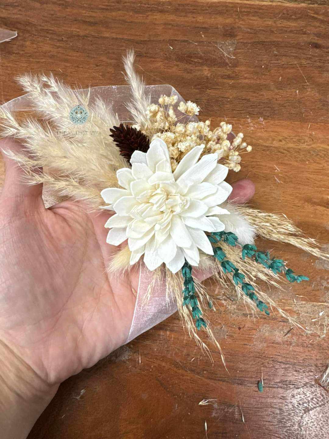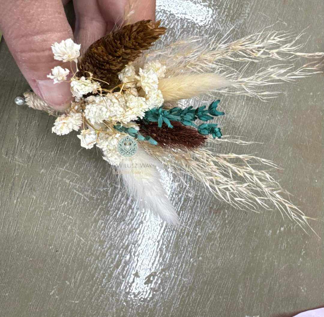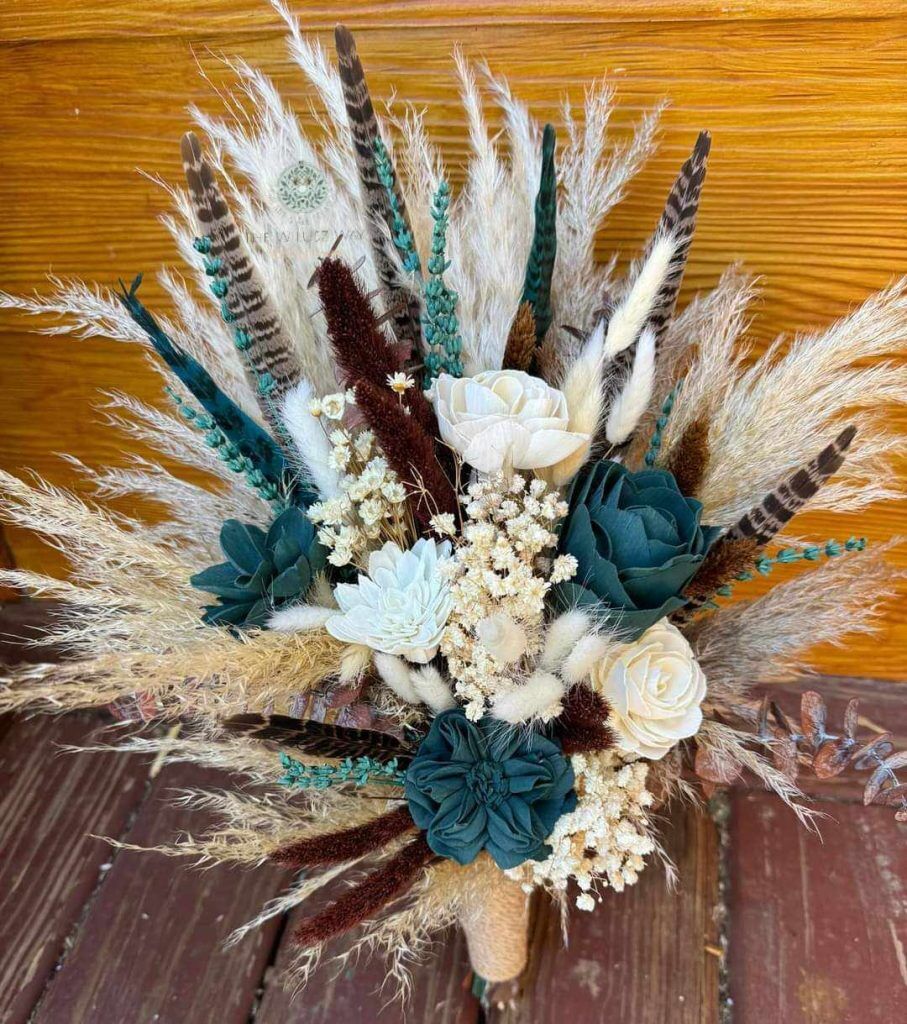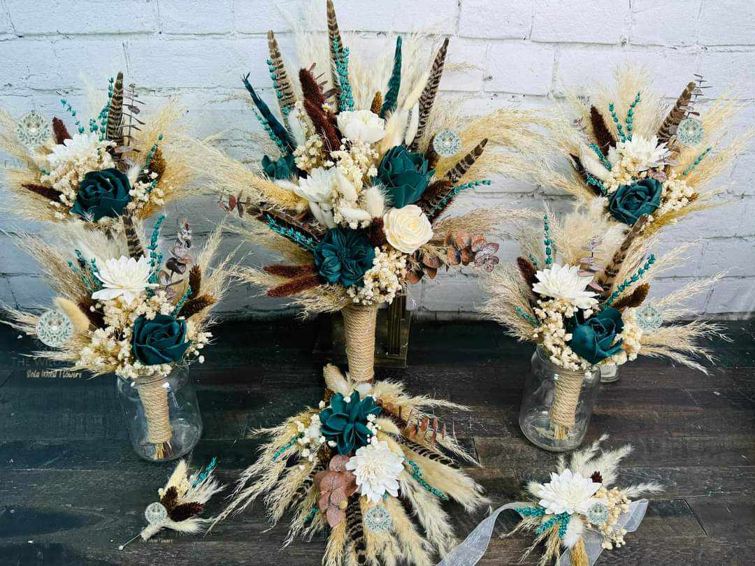 Texas Walker Collection:: Taking boho country to another level with this dark teal color pop! Our set of hand dyed wood flowers feature real pheasant feathers and are surrounded by real preserved pampas, babies breath, spiral eucalyptus, bunny tails, and natural dried fillers. Cowboy hat and boots are not required, you just need out "Texas Walker" Collection to get you that country swag!