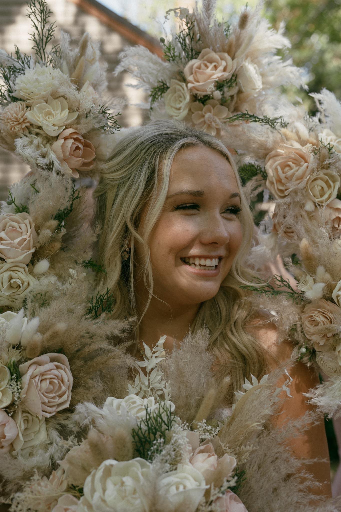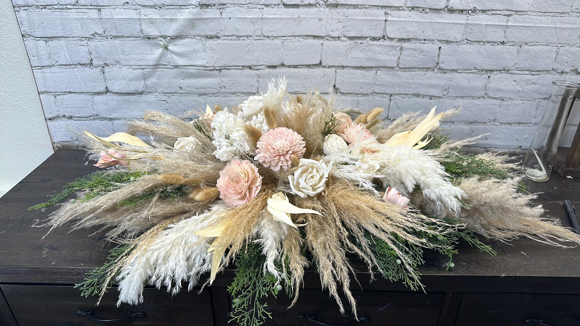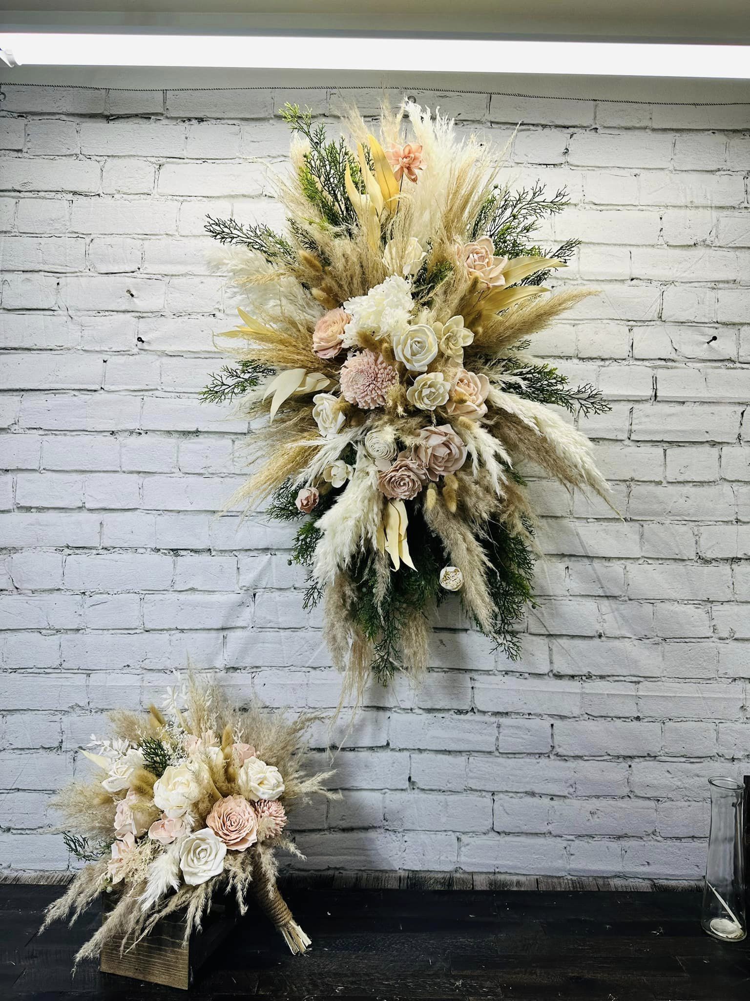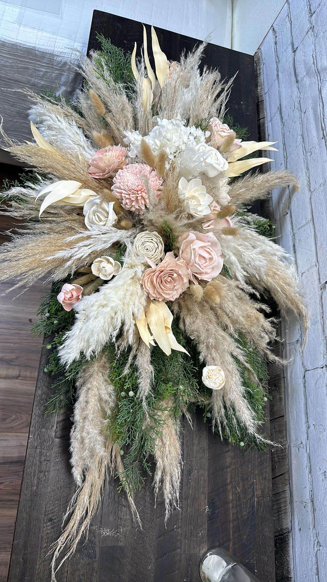 The Blushing Bride Collection:: Romance is in the air! With a soft color scheme of wood flowers, this set is surrounded by real preserved pampas, bunny tails, ruscus, and finished with a bit of greenery and some other natural dried fillers. Our Blushing Bride Collection is prefect for a graceful, boho style bride!