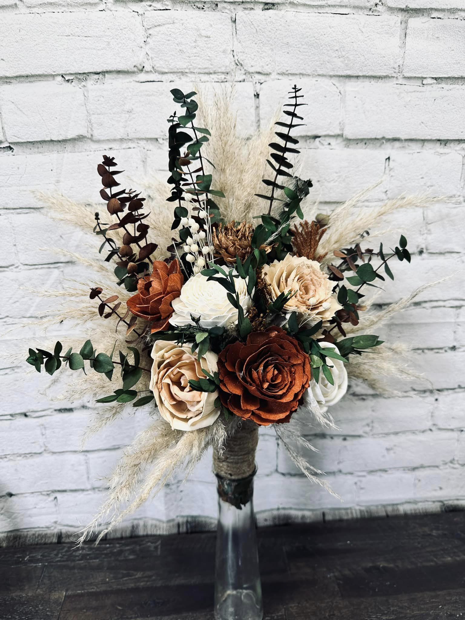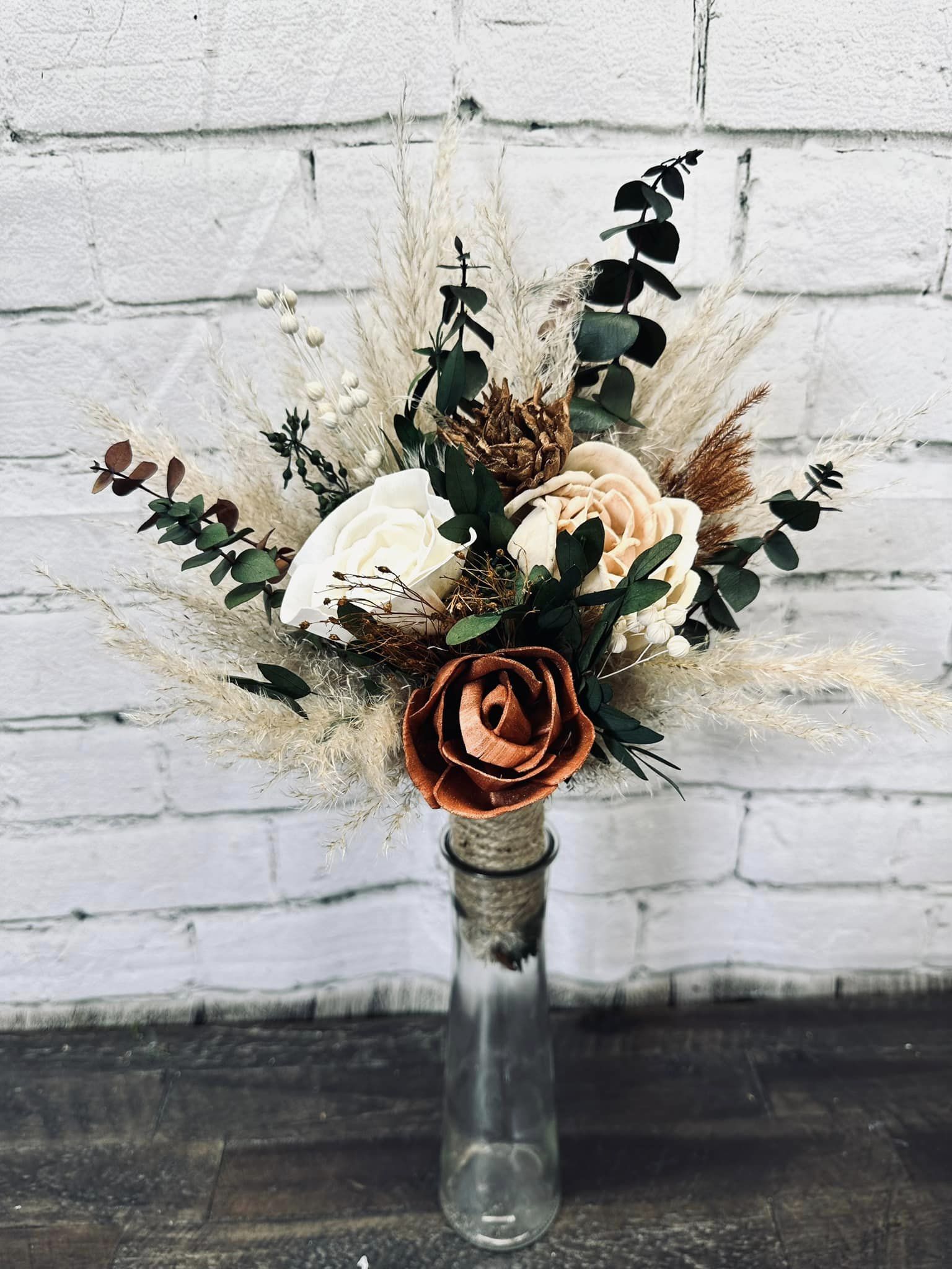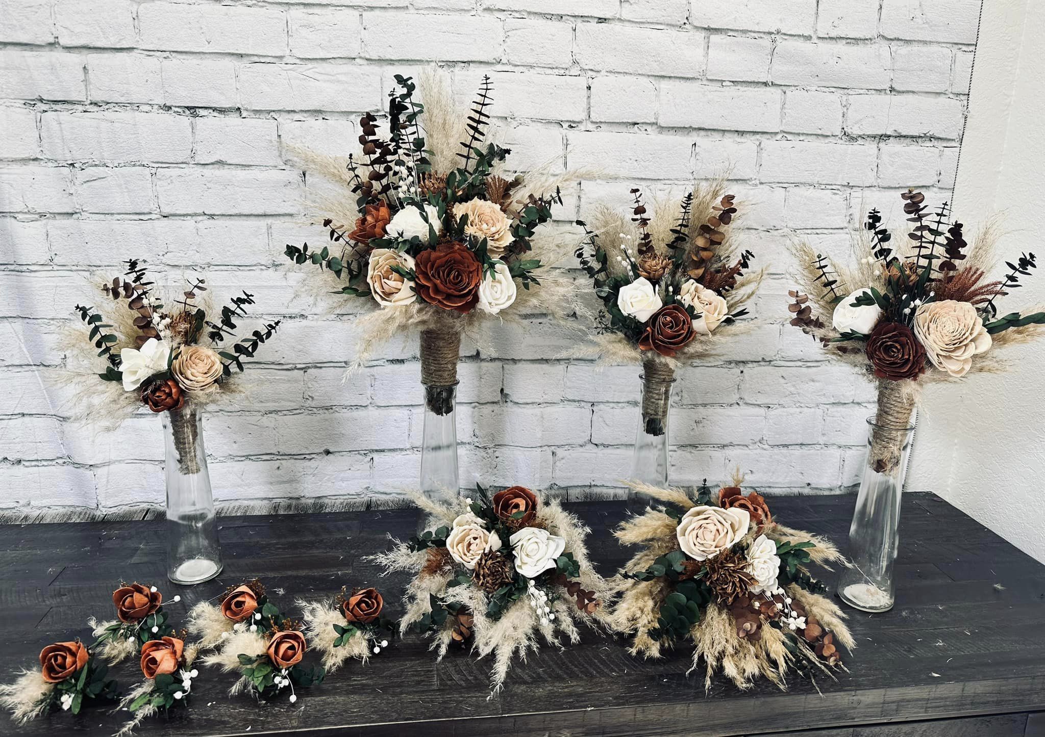 Toasted Marshmallow Collection:: Our newest set is rustic boho with a simple or minimalistic, twist! A warm color collection of wood flowers, with real preserved pampas, spiral eucalyptus, and a tiny hint of other natural dried fillers. Toasted Marshmallow Collection will warm the hearts of all your loved ones as you walk down the aisle!