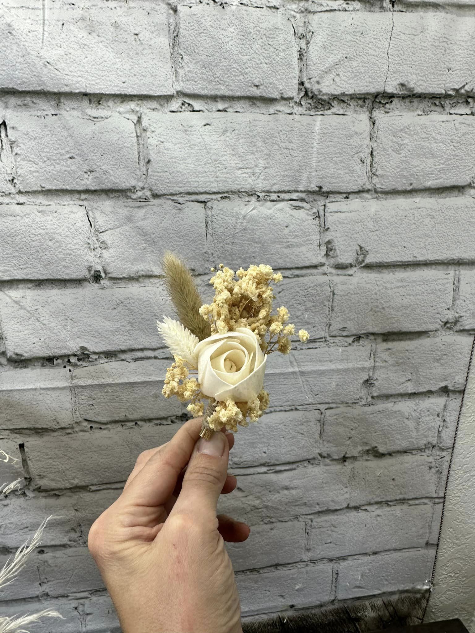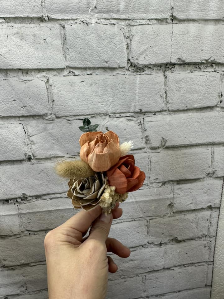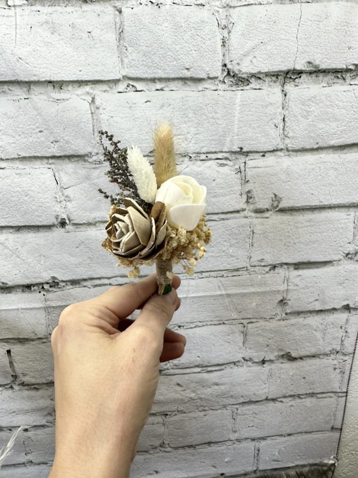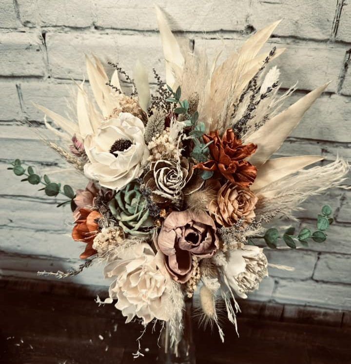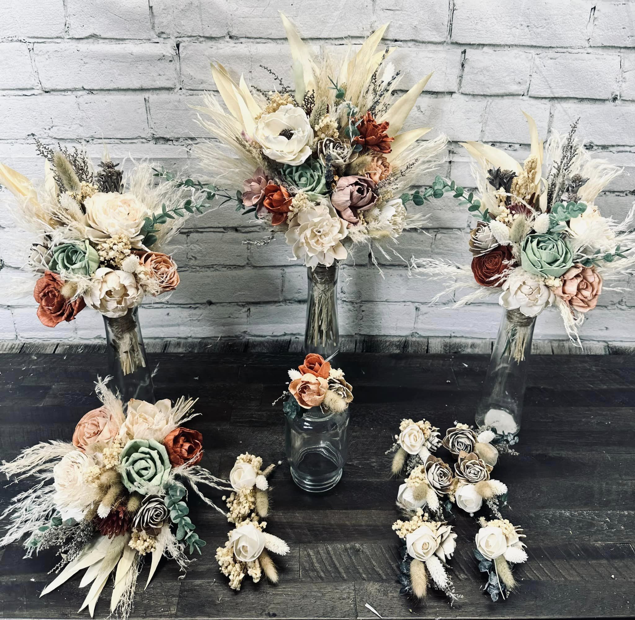 Warm Wishes Collection:: Such a gorgeous collection of colors! This set of wood flowers is finished with real preserved pampas, spiral eucalyptus, bunny tails, and other greenery. Make all your dreams come true, when you walk down the aisle with our Warm Wishes Collection!