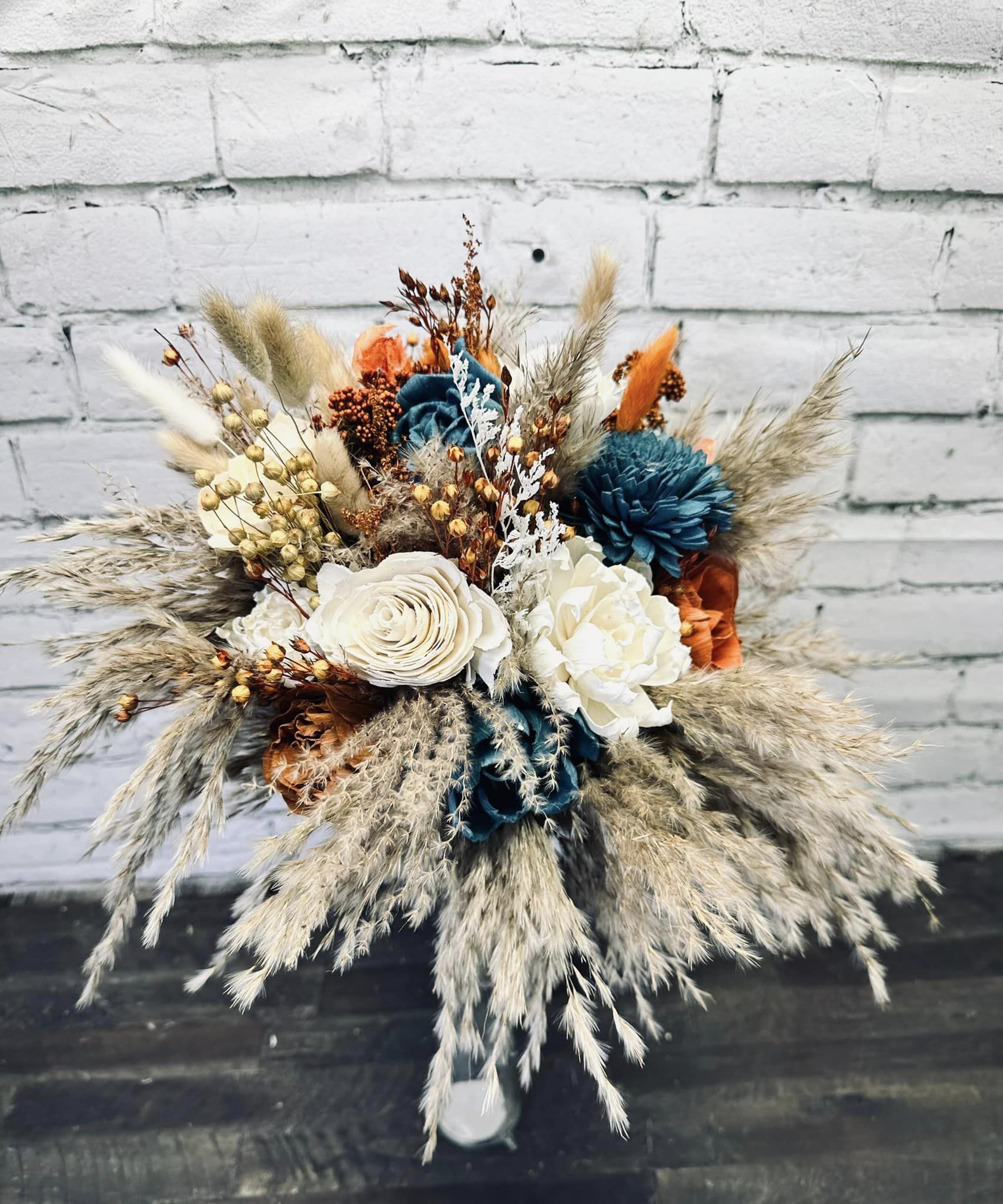 Windy City Collection:: This rustic boho set is warm with a touch of love. A variety of hand dyed wood flowers is completed with real preserved pampas, bunny tails, and other filers. Our Windy City Collection is perfect for any bride!