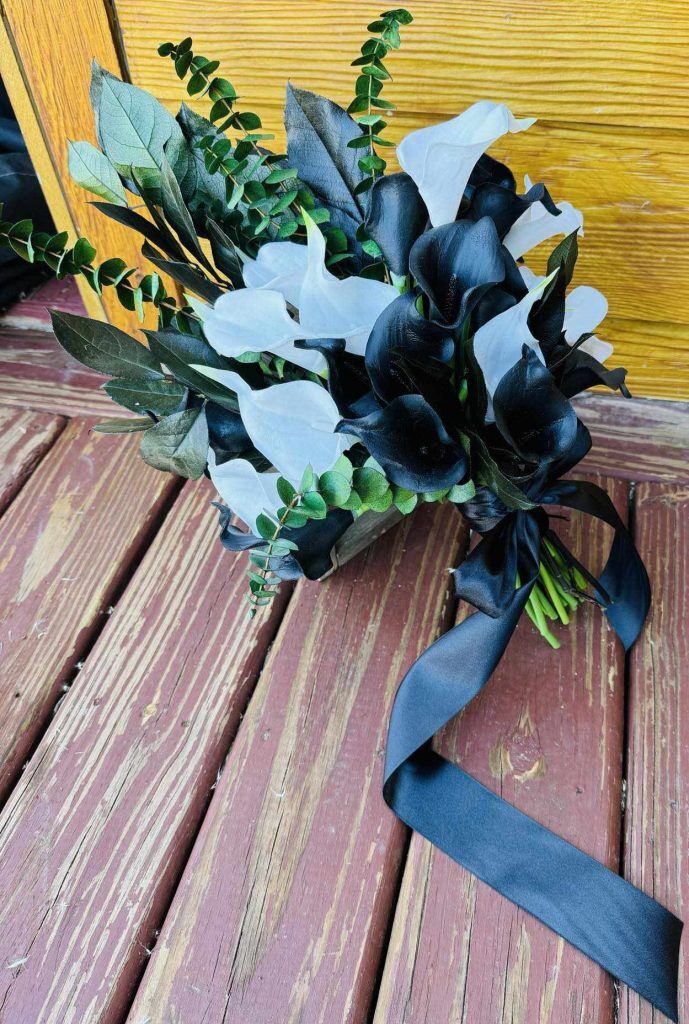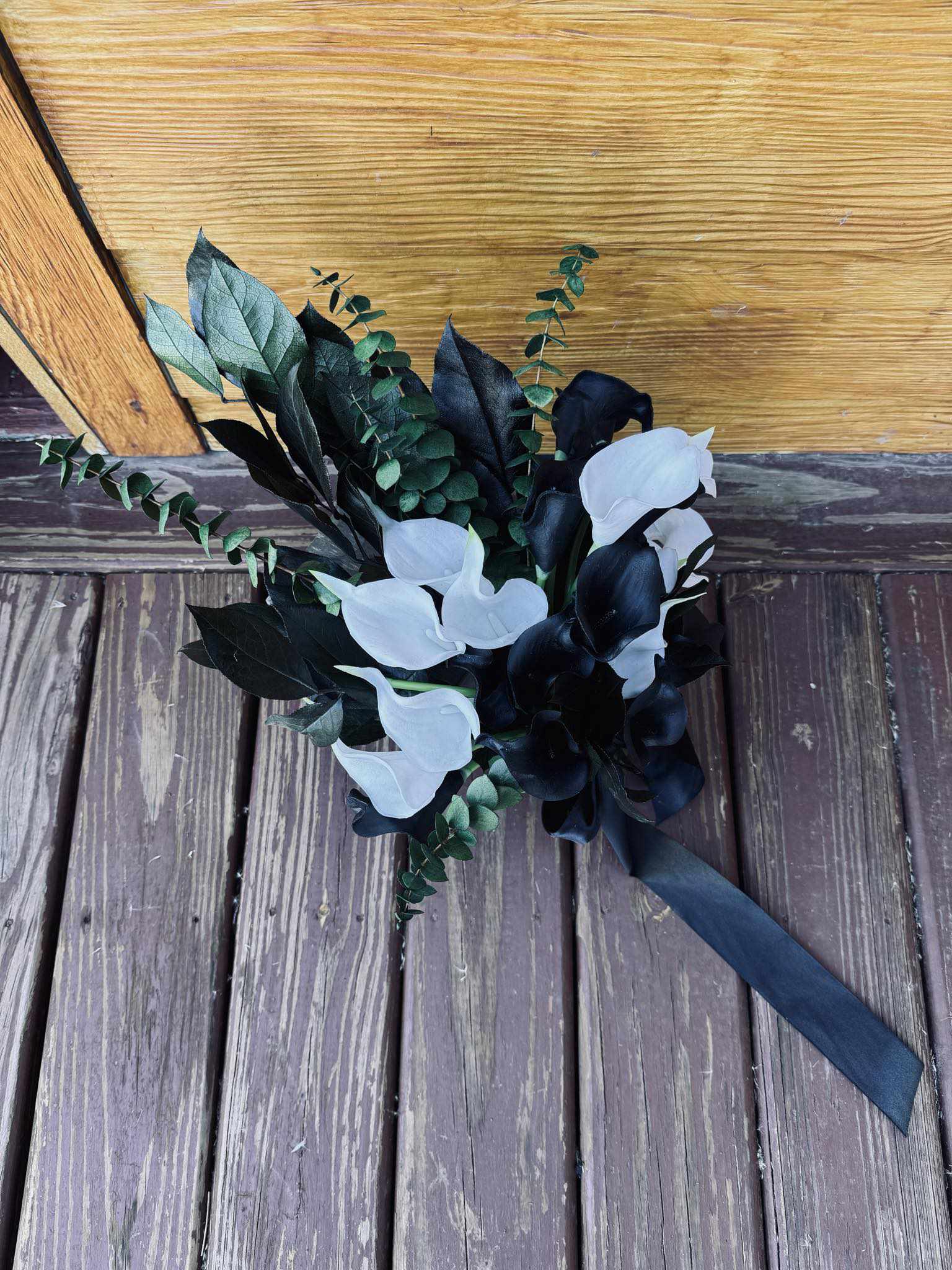 Ying Yang Collection:: A specialty set for a unique look! These calla lillies are paired with real preserved spiral eucalyptus, salal, and a natural dried blue filler. There is no me, without you- and nothing says that more than our Ying Yang Collection.